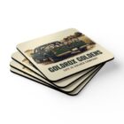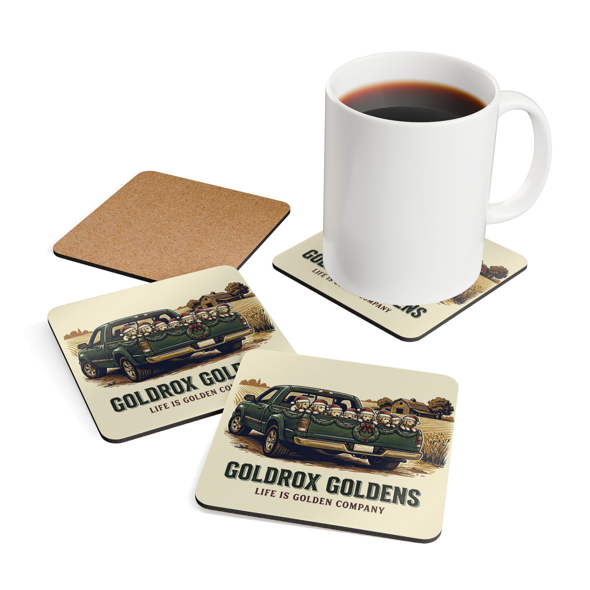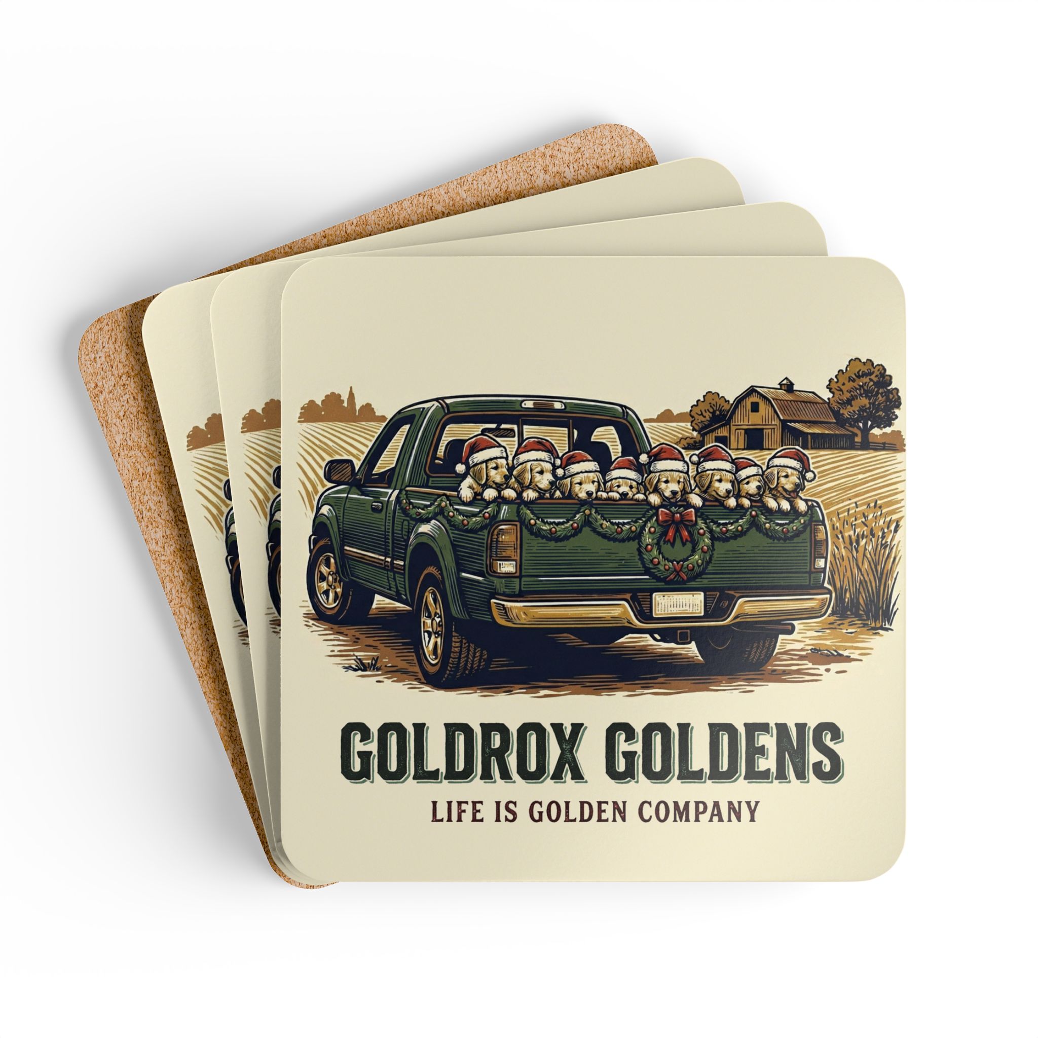 These cork-backed coasters bring warm, nostalgic charm to cozy gatherings. Each 3.75″ square carries a high-gloss printed top with rich, vintage-style artwork—a pickup truck loaded with festive golden retrievers and a sunlit farmhouse in the background—so every cup sits on a scene that feels like homecoming. The sturdy 0.16″ MDF top keeps designs vivid and resistant to wear, while the natural cork underside grips surfaces and protects wood from heat and moisture. Sold as a set of four, they tuck easily into a kitchen drawer or a holiday hostess basket and add a lived-in, rustic touch to coffee mornings, family dinners, and seasonal get-togethers.